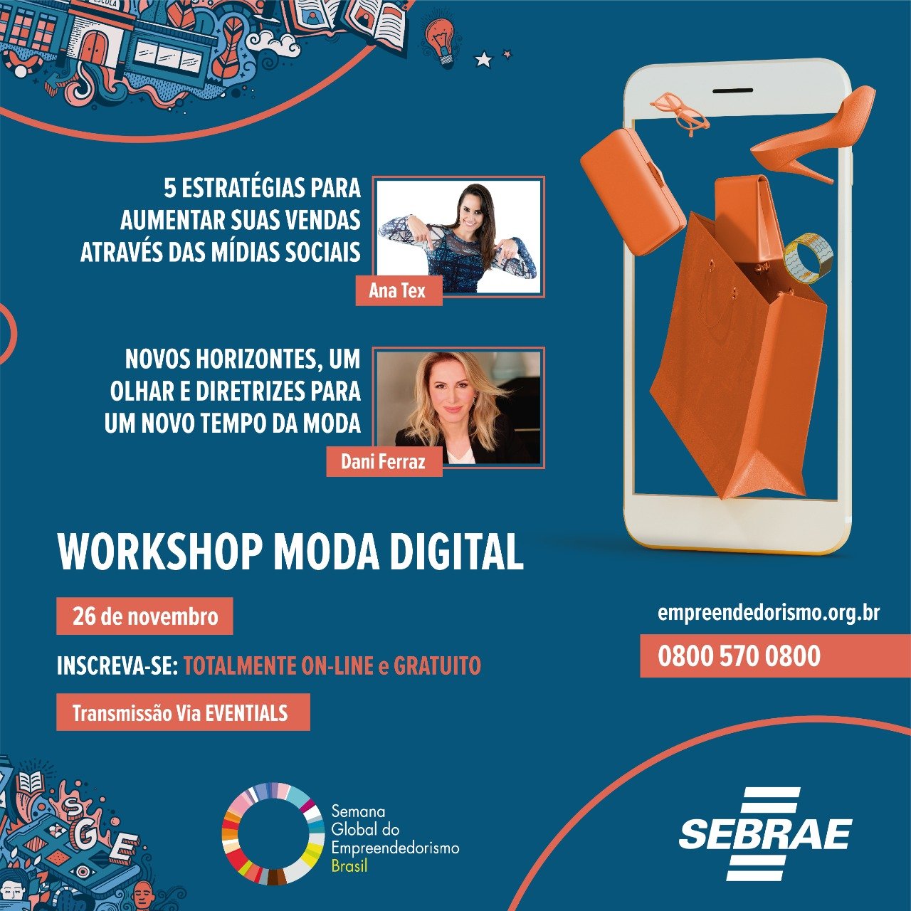Na próxima quinta-feira (26), o Serviço de Apoio às Micro e Pequenas Empresas, Sebrae no Piauí, realiza o Workshop Moda Digital, como parte da Semana Global do Empreendedorismo. O workshop, totalmente on-line e gratuito, terá início às 18h20, sendo transmitido pelo Canal do Sebrae, na plataforma Eventials.