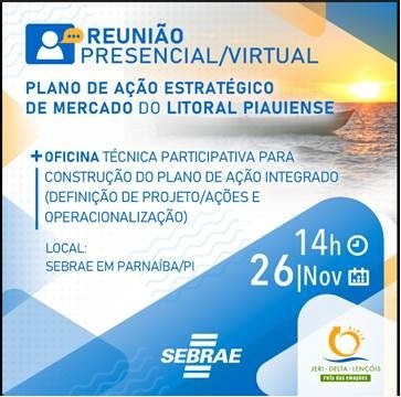 O Serviço de Apoio às Micro e Pequenas Empresas, Sebrae no Piauí, realiza hoje (26), a partir das 14h00, uma oficina técnica participativa para definição de projetos e ações que irão compor o Plano de Ação Estratégico de Mercado do Litoral Piauiense. O evento, em formato híbrido, acontecerá diretamente da sede do Sebrae em Parnaíba.