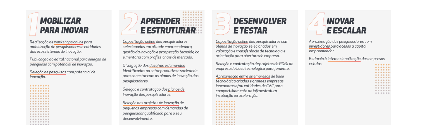 Esse é o momento em que os pesquisadores vão desenvolver o seu mindset empreendedor, assim como os planos de inovação que serão submetidos a uma nova etapa do programa, por meio do próximo edital com previsão de lançamento em maio deste ano.