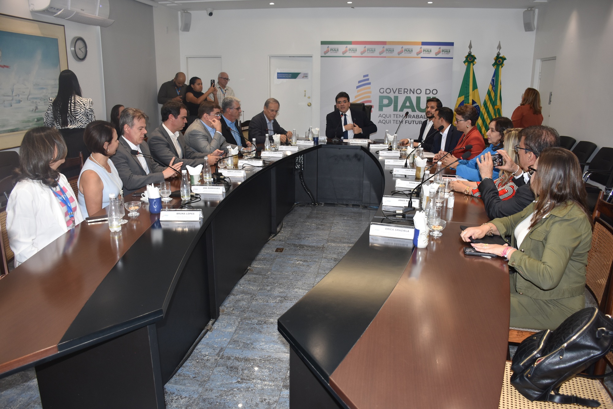 A reunião de assinatura do acordo – que aconteceu na tarde de hoje (09), no Palácio de Karnak – contou com as presenças do governador do Estado, Rafael Fonteles; do diretor técnico do Sebrae Nacional, Bruno Quick; do presidente do Conselho Deliberativo, Filemon Paranaguá, e dos diretores executivos do Sebrae no Piauí, Júlio César Filho, Delano Rocha e Mário Lacerda; do secretário de Estado da Educação, Washington Bandeira; da presidente da Undime e secretária municipal de Educação de Domingos Mourão, Erica Graziela; entre outras autoridades e técnicos do governo do Estado e do Sebrae Nacional e no Piauí.